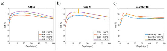 The individual temperature GDOES graphs for Ni in (a) air, (b) oxyfuel and (c) lean oxyfuel atmosphere.