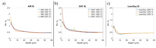 The individual Si GDOES depth profiles for air (a) and oxyfuel (b) atmospheres can be seen in Figure 9. Differences within a single atmosphere were limited to between 0 and 30 µm. For the air atmosphere, the highest Si value was at 1250 °C at the original sample surface with 2 wt. %. The highest Si value for oxyfuel atmosphere was at 1225 °C near 3 wt. %. The other Si peaks fell between 1.2 and 1.4 wt. % for both atmospheres.
