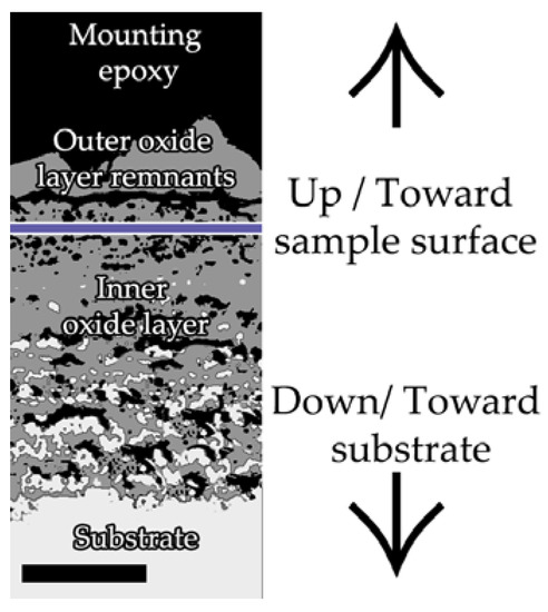 A modified, schematic FESEM BSE image with the substrate, inner oxide layer, outer oxide layer remnants, mounting epoxy, directions and the original sample surface marked as a horizontal purple line. Original image scale bar (black bar at the bottom of the image) is 75 µm.