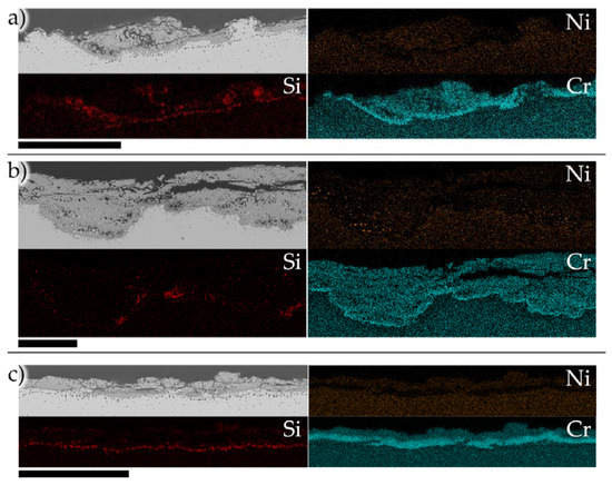 BSE image and corresponding energy dispersive X-ray (EDS) maps for Ni, Si and Cr in 1225 °C for (a) air atmosphere, (b) oxyfuel atmosphere and (c) lean oxyfuel atmosphere. Scale bar is 50 µm.