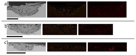 EDS maps for 1275 °C; (a) air, (b) oxyfuel and (c) lean oxyfuel atmospheres. Ni shown in amber, Si EDS map shown in red. Scale bar is 100 µm.