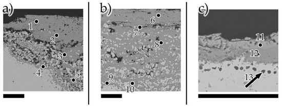 EDS point analysis locations in 1275 °C, (a) air, (b) oxyfuel and (c) lean oxyfuel atmospheres. Scale bar is 25 µm.