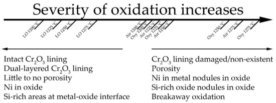 For morphology, the oxidation can be considered as a continuous process, the rate of which is defined by the temperature, atmosphere and time. Morphology is the end result of the point at which this process is halted. As the time period and per-temperature heating curves were constant, atmosphere is the only variable in the function defining the severity level of the oxidation. As such, a schematic representation between the relative severity of oxidation between all temperatures and atmospheres, and the corresponding constituents to the morphology, are presented in Figure 15. The relativity between the samples is based on the ratio of the depth of the inner oxide layer and the end scaling amount. When the severity of oxidation increases, the likelihood of the left-side group constituents decreases, and the likelihood of the right-side constituents increases.