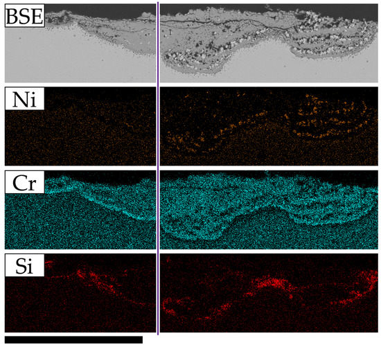 The Ni depth profiles for the oxyfuel atmosphere’s 1200 °C and 1225 °C samples were very close to each other. However, for the air atmosphere, the 1200 °C Ni depth profile was very close to the one for 1250 °C. Considering all this, the 1250 °C temperature at the air atmosphere is similarly different from what the 1225 °C temperature is in the oxyfuel atmosphere. Both exhibit a high Si content near the original sample surface and come closer to their one 25 °C step below the TG result than the same step higher. The occurrence of the Ni-particles in the inner oxide layer is linked to the Cr2O3 lining at the metal/oxide interface starting to dissipate. This is evident from Figure 16: from the oxyfuel sample at 1225 °C, it depicts the BSE, Ni, Cr and Si EDS maps of the sample. Observing the image, it can be seen that to the left of the vertical purple line, the Cr2O3 is intact, with minimal Ni particles inside the inner oxide layer above the lining. To the right side of the purple vertical line and directly below the lining, seen as darker areas in contrast to the same position on the left, the Cr content can be seen to have diminished at the metal substrate. Additionally, Ni particles now appear in wave-like patterns in the cross-section of the sample. The composition of the Ni particles, with varying ratios of Ni and Fe, up to 90 wt. % of Ni and 3 wt. % of Cr, would place it as γ-(Fe,Ni) with diluted Cr [44,45].
