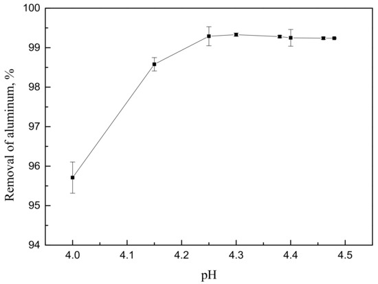 29] and ion exchange were used to purify the acidic vanadium-containing solution. However, when concentrations of Al and Si in the solution are higher, it is more likely that three phases and turbidity appear in the solvent extraction system. In addition, solvent extraction involves many operational steps, like reduction (Fe