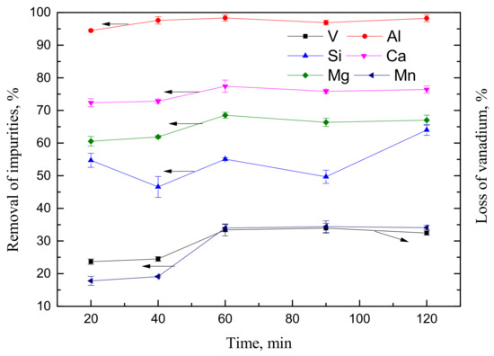 4F can effectively remove impurities of Ca and Mg from the acidic vanadium-bearing solution, while almost all of Al and partial Si precipitate simultaneously due to the increase in aqueous pH value, but the loss of vanadium is higher, with about 23% vanadium precipitating in the first 20 min, and after purification, the slurry is hard to filter.
