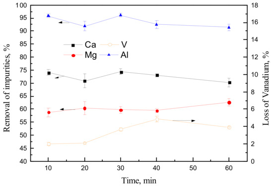 Since NH4+ is contained in the precipitant MnNH4F3, adding MnNH4F3 results in an increase in the pH of vanadium-bearing solution, up to 4.15, which promotes the hydrolysis of Al3+ to form precipitate of Al(OH)3. As a result, adding MnNH4F3 can remove impurity of Al simultaneously. The removal of Al is over 95% in the first 10 min, but as the reaction time is furthered, the removal of Al decreases slightly due to a drop in aqueous solution pH value caused by slow ammonium volatilization from the solution at 65 °C. When the stirring time is increased to 60 min, the pH value declines to 3.73.