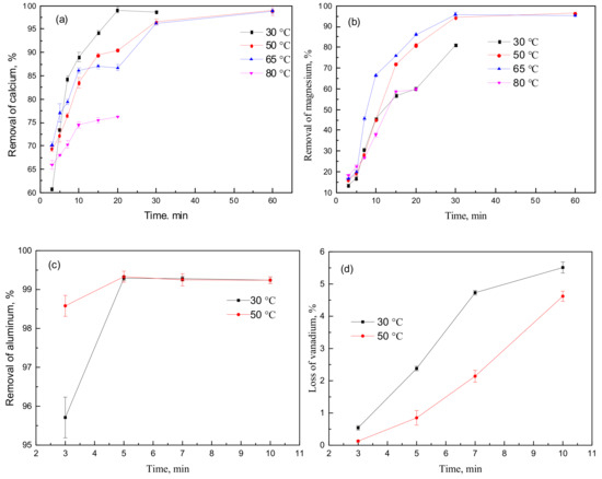 In the calcium roasting process, the vanadium spinel contained in the vanadium slag is oxidized and reacted with calcium additive (CaO or CaCO3) at a temperature of 800–850 °C to form calcium vanadate. Then, the roasted slag is leached with dilute sulfuric acid at an optimum pH range of 2.00–3.00, and vanadium is recovered into the acidic solution. However, other elements, like calcium, magnesium, manganese, aluminum, silicon and so on, also transfer into the solution. The calcified roasting-dilute sulfuric acid leaching process was first put forward and carried out by the Tula Vanadium Factory in 1974. Hereafter, Pangang Research Institute of China also performed a lot of work on this process. However, because the problem of purifying the acidic vanadium solution was still unsolved, the purity of vanadium pentoxide produced with this process was only 93–94%, and it was inferior to the product from the sodium roasting process. Hence, it is essential to find an efficient, green and economical way to remove impurities from the acidic vanadium-bearing solution.