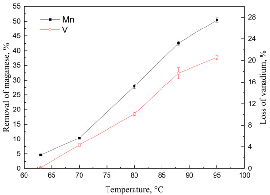 A stated volume of vanadium-bearing solution was added into a three-necked flask. When the target temperature was reached, fluorine salt was added at a specific molar ratio and then the stirring started. During the purification process, the pH values of solution were adjusted by ammonia hydroxide or dilute sulfuric acid. When the reaction ended, the flocculant polyacrylamide was added, stirring for 5 min, and then the solution was let stand for a period. After filtration, the filtrate was collected, and its volume was recorded. The concentrations of Ca, Mg, Al and Si in the filtrate were measured by ICP-OES (Optima 4300DV, PerkinElmer Company, Waltham, Massachusetts, USA) and the concentration of V was determined by titration of ammonium ferrous sulfate. Based on these measured data, the removals of Ca, Mg, Al and Si, and the loss of V were calculated. Ammonium persulfate was added at a certain excess coefficient into the above filtrate of 200 mL to oxidize and precipitate Mn2+.