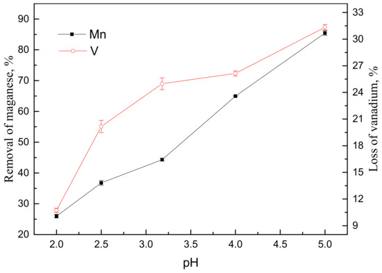 33]. The ammonium salt method could alleviate the side effect of impurities of Mn and Ca, producing a higher grade of vanadium pentoxide than the hydrolysis method. As stated above, the main impurities affecting the quality of vanadium pentoxide were Ca, Mg, Mn, Al and Si, hence in order to obtain the qualified product of vanadium pentoxide, it is essential to remove those impurities from the acidic vanadium-bearing solution.