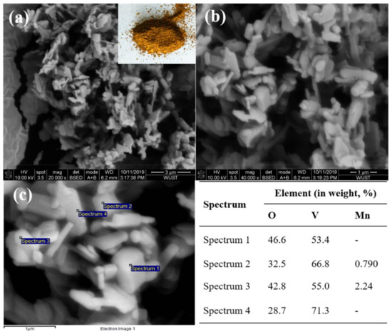 31]. In order to further figure out the effect of these impurities on the quality of vanadium pentoxide, we used the hydrolysis method at an initial pH of 1.8 and 96 °C, and the ammonium salt method at pH 2.0 and 96 °C to precipitate vanadium from the unpurified vanadium-bearing solution respectively, and after calcination at 550 °C for 2 h, the final product of vanadium pentoxide powder was obtained. The chemical composition analysis showed that the content of V