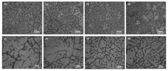 OM (optical microscope) images of alloys with different Zr content: (a,b) Alloy A: 0.10%; (c,d) alloy B: 0.15%; (e,f) alloy C: 0.20%; (g,h) alloy D: 0.25%.