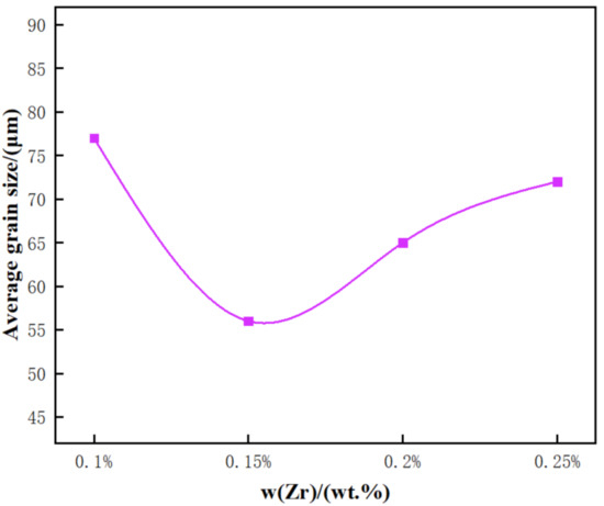 The Zr element has a certain effect of grain refinement, but when its content is higher than 0.15 wt.%, there will be uneven grain refinement. The maximum grain size is more than 120 μm, while the minimum grain size is less than 30 μm, and the grain size difference is large at 0.25 wt.% Zr. In addition, with the increase of Zr content, the composition segregation was serious, a large number of second phases appeared in the grains, and the Zr element segregates, forming many primary Al3Zr phases.