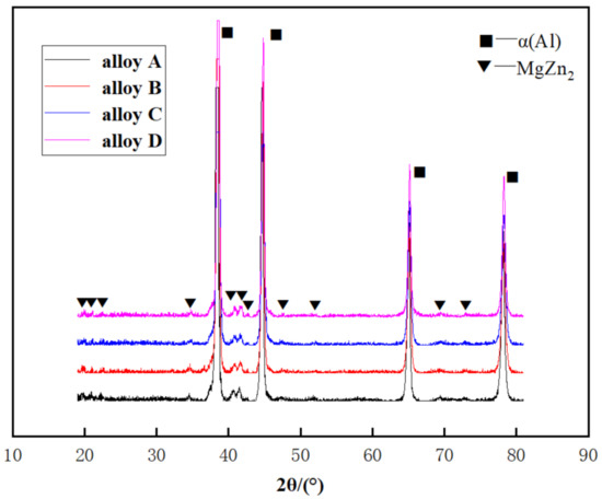 Figure 2 shows the OM images of as-cast alloys with different Zr content. Based on grain size statistics (Figure 3), it is found that with the increase of Zr content, grain size decrease gradually, and alloy B (Figure 2c) has the best grain refinement effect, the average grain size is 56 μm. However, with the continuous increase of Zr content, part of the grains become coarse, and the grain inhomogeneity of alloy D (Figure 2g) is particularly serious, minimum grain size is less than 30 μm, and maximum grain size is more than 120 μm. At high magnification (Figure 2b,d,f,h), some black substances with the shape of dots were observed in the crystals, and the amount of black spots increased with the increase of Zr content. XRD patterns are shown in Figure 4. It can be clearly seen that all of these four alloys consist of α-Al and MgZn2 phases. The different Zr contents did not change the main phases of the alloys.