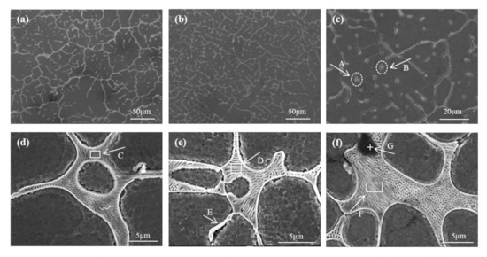 SEM (scanning electron microscope) images of squeeze casting process (SC) sample alloy with different magnifications (wt.%): (a,d) Alloy A; (e) alloy C; (b,c,f) alloy D.