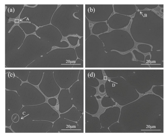 Figure 4 shows the typical eutectic phase of as-cast Al-Zn-Mg-Cu alloy by SEM. The dark areas are the primary solid solution α-Al, and the bright areas are the non-equilibrium eutectic phases. The Energy Dispersive Spectroscopy (EDS) analysis results are listed in Table 2. It can be seen from Figure 5a,b that there are a large number of non-equilibrium eutectic phases in the as-cast structure of the alloy, which are distributed in the grain boundary in the form of network, and there are many second phases in the grain. According to EDS analysis results, the second phase in the grain is the quaternary phase of Al ZnMgCu (Points A, B), and the content of Zn, Mg, and Cu is relatively high. The non-equilibrium eutectic phase at grain boundary is mainly composed of α (Al) and an AlZnMgCu quaternary phase (Points C, D, and F), and a small amount of Al2Cu phase (Point E) is also found. AlCuFe phase (Point G) is also found at some grain boundaries. The composition of the non-equilibrium eutectic phases did not change much in each sample alloy.