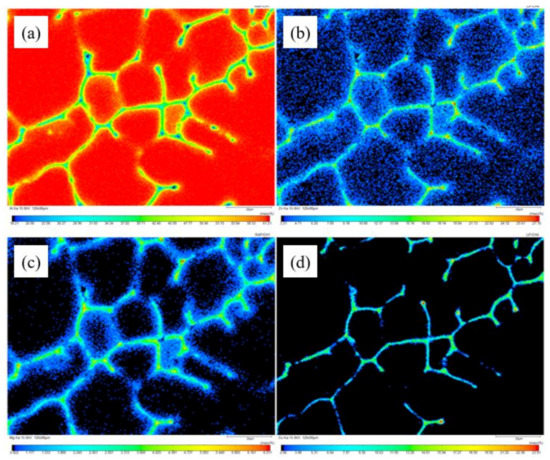 Main elemental distribution in SC sample of Alloy C: (a) Al; (b) Zn; (c) Mg; (d) Cu.