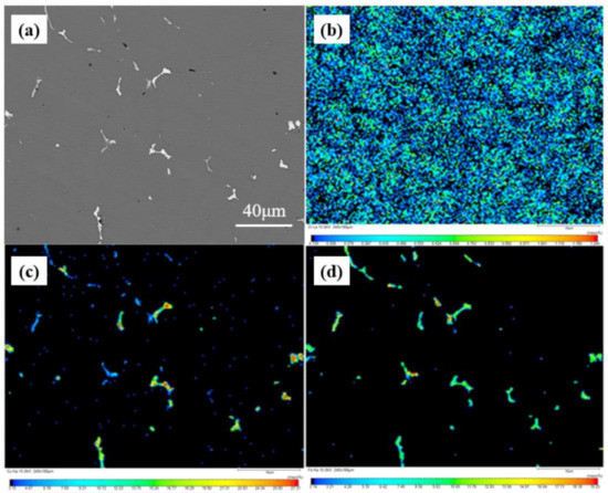 Since the content of Zr element is much lower than other main alloying elements, it is difficult to observe the segregation of Zr in as-cast condition. Therefore, alloy C after solution heat treatment was detected by electron microprobe. Figure 6 shows Backscattered Electron (BSE) images of SC sample (alloy C) after solid solution treatment and its Electron Probe Microanalysis (EPMA) elemental map for Zr. The bright color indicates that the concentration of Zr is higher in this area. It is found that there are many insoluble phases containing Zr from Figure 6b. Due to the low diffusion coefficient of Zr element, it is difficult to form a new large-size phase during heat treatment. Therefore, these Zr-containing insoluble phase are formed due to the aggregation of Zr during solidification. The Zr-containing phase is distributed in a strip or a disc shape (Figure 6c). The EDS analysis result of point A is shown in Figure 6d. The elements at the center of the strip-like second phase are Al and Zr, and the atomic ratio is about 3:1, which can be inferred to be primary Al3Zr phase. It also proves that when Zr content is high, Zr elements tend to aggregate to form primary Al3Zr phase. The phase has high thermal stability, which is difficult to be eliminated by conventional heat treatment and will inevitably affect the properties of the material.