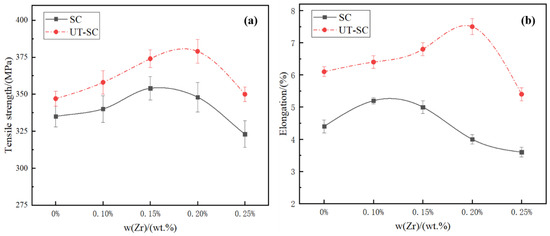 Tensile strength (a) and elongation(b) in as-cast state of SC and UT-SC samples with different Zr.