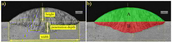 The prepared specimens were examined in an Axio Imager. M2m light optical microscope manufactured (Carl Zeiss AG, Jena, Germany) to investigate bead morphology and to detect presence of internal defects. The geometric features, like height, width, penetration depth and dilution, were investigated. Using the inbuilt software in the microscope, multiple images of different regions of the cross-sections were taken at the ten-fold magnification. Afterwards, the images were combined to visualize the entire cross-section. Figure 3a presents an example of a cross-section. The dilution ratio () was calculated by the following equation