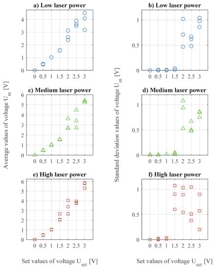 The average values of the measured voltage and the standard deviations of each deposition in relation to the set voltage : (a,b) low laser power, (c,textbfd) medium laser power, (e,f) high laser power.