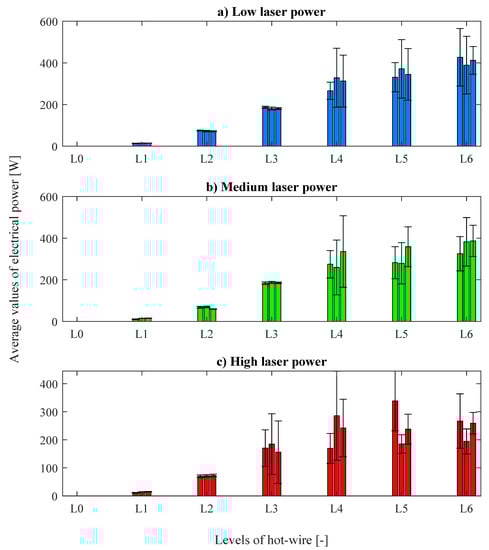The average electrical power relative to each hot-wire level: (a) low laser power, (b) medium laser power, (c) high laser power.