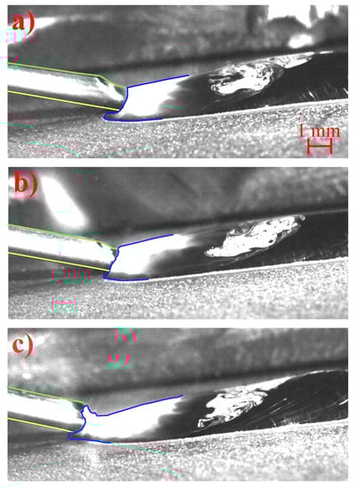 The wire-melt pool interaction acquired by the off-axis high-speed camera when three different levels of hot-wire and the medium laser power were applied: (a) L1—low hot-wire level, (b) L3—medium hot-wire level, (c) L6—high hot-wire level.