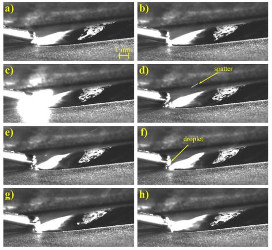 The sequence of images acquired by the off-axis high-speed camera showing the process instability when the medium laser power and high hot-wire level (L6) were applied: (a) the transition link between the molten wire and the melt pool (t = 1.659232 s), (b) the narrowing transition link between the molten wire and the melt pool (t = 1.682776 s), (c) the arcing occurring with the break of the transition link (t = 1.684015 s), (d) the spatter (t = 1.685254 s), (e) the disturbed melt pool surface (t = 1.686493 s), (f) the start of droplet formation ( s), (g) the development of the droplet (t = 1.697646 s), (h) the temporarily reconnection of the molten wire and the melt pool (t = 1.702602 s).