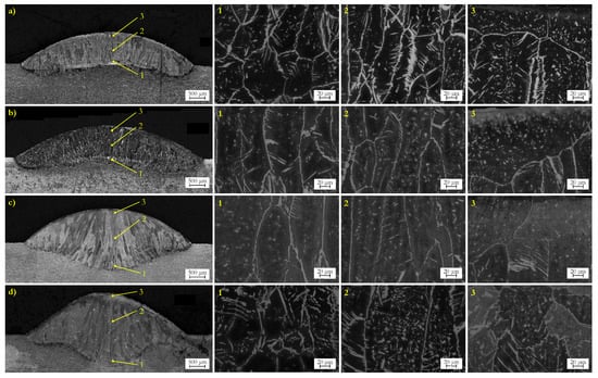 The cross-sections of the beads produced with the medium laser power and different levels of hot-wire: (a) L0—cold wire, (b) L1—low hot-wire level, (c) L3—medium hot-wire level, (d) L6—high hot-wire level.