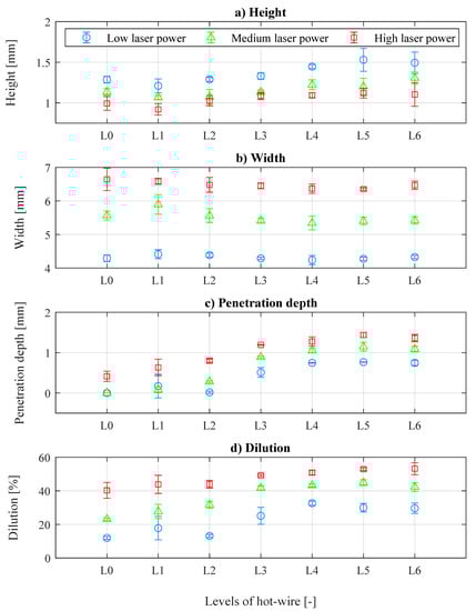 The effect of the hot-wire on the dilution is presented in Figure 9d. The dilution of the beads deposited with the high laser power experienced the least dependence. For the hot-wire levels L1 and L2, the dilution increased by compared to cold process, reaching on average the level of . The highest level of the dilution was reached for the hot-wire level L6 and was equal to . For the medium laser power, the extent of the dilution almost doubled compared to the cold process, reaching up to for the hot-wire level L3. The further increment of hot-wire level, did not bring any significant increase in the dilution. In the case of the low laser power, the dilution increased on average from 11.9 to when the hot-wire increased from level L0 to L3. This means more than two-fold increase compared to the cold process conditions. The further increase in the hot-wire level contributed to an increase of the dilution as the value reached at the highest for the hot-wire level L4, increasing almost three times relative to the cold process.