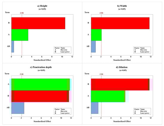 To characterize the influence of the resistive pre-heating and the laser power on the geometric features, the full factorial statistical analysis was applied. The hot-wire level and laser power level were selected as independent variables. Height, width, penetration depth and dilution were considered to be the responses. For each response, three values, each measured on a cross-section obtained from a separate deposition, were analyzed. The analysis was performed with confidence level, corresponding to . The analysis included hot-wire levels between L0 and L3 where for most of the depositions, the process was stable. The remaining data related to unstable process conditions were excluded from the statistical analysis as they provide little usefulness when setting up real-case depositions. The analysis was performed using Minitab software, using the inbuilt DOE toolbox. To judge which factors and their interaction had a statistically significant influence on each of the responses, Pareto charts of standardized effects were created and analyzed.
