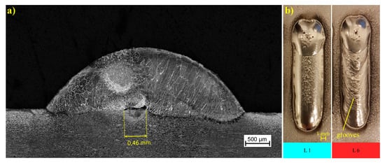 The examples of defects identified in the deposited beads: (a) the lack of fusion in the middle of the bead, (b) a comparison of surface conditions obtained by applying two different levels of the hot-wire–smooth surface, the hot-wire level L1 (image to the left), rough surface with groves, the hot-wire level L6 (image to the right).