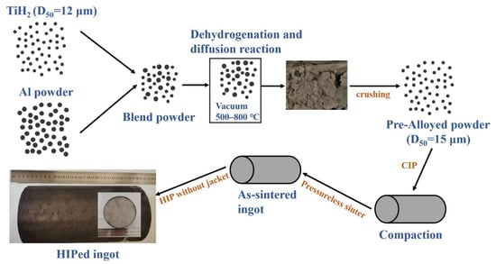 After that, the PA powder was compacted by cold isostatic pressing (CIP) at 200 MPa for 120 s. Then, the compacts were respectively sintered at 1300, 1350, 1400, and 1450 °C for 150 min with a heating rate of 3 °C·min−1. Accordingly, these samples were referred to simply as T1300, T1350, T1400 and T1450. Finally, HIP was performed on the sintered T1350 and T1400 samples to obtain high relative density, and the two samples were marked as H1350 and H1400. The HIP parameters were 1200 °C/140 MPa/120 min. The schematic diagram for the preparation process of PM TiAl alloy is presented in Figure 1.
