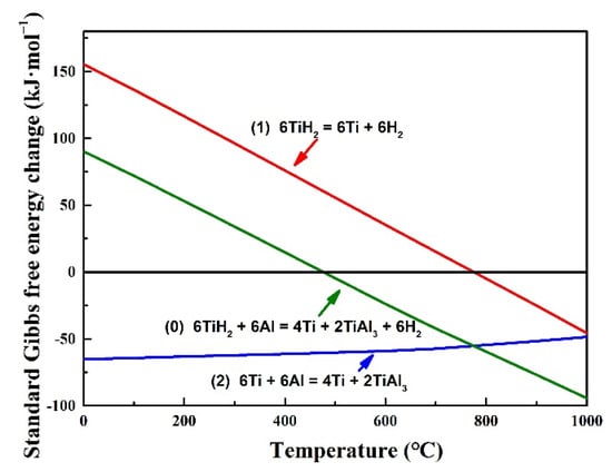 Figure 2 shows the ΔG of Equations (1) and (2) with a function of temperature. The ΔG value was less than 0 when the temperature was above 500 °C, indicating that the reaction can proceed spontaneously since the ambient temperature was above 500 °C. Therefore, the minimum reaction temperature was set as 500 °C. The reaction of TiH2 and Al included two reaction processes: Firstly, the endothermic reaction of TiH2 decomposing into Ti and H2. Secondly, the exothermic reaction of Ti and Al forming TiAl3. When temperature was lower than 800 °C, the ΔG > 0 of TiH2, the decomposition reaction indicated that the heat released by the formation of TiAl3 between Ti and Al was absorbed by the decomposition of TiH2.