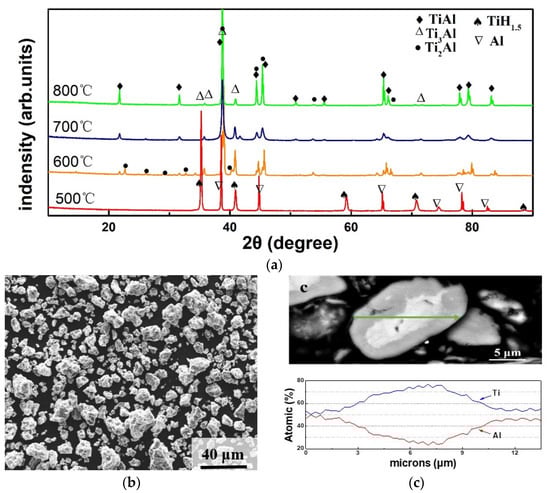 Based on the thermodynamic calculation results, the blended TiH2 and Al powders were designed to pretreat at 500, 600, 700, and 800 °C. After treatment, the phases of the powders are shown in Figure 3a. At 500 °C, TiH2 decomposed partially, and the main phases were TiH1.5 and Al. There was no obvious diffraction peak of intermetallic compound. At 600 °C, Al had been completely consumed, and the main phases were γ-TiAl, Ti2Al and a small amount of α2-Ti3Al phase. At 700 °C, the Ti2Al phase content decreased, while the γ-TiAl and α2-Ti3Al phase content increased. Upon increasing to 800 °C, the reaction progressed completely, and only γ-TiAl and α2-Ti3Al phases existed.