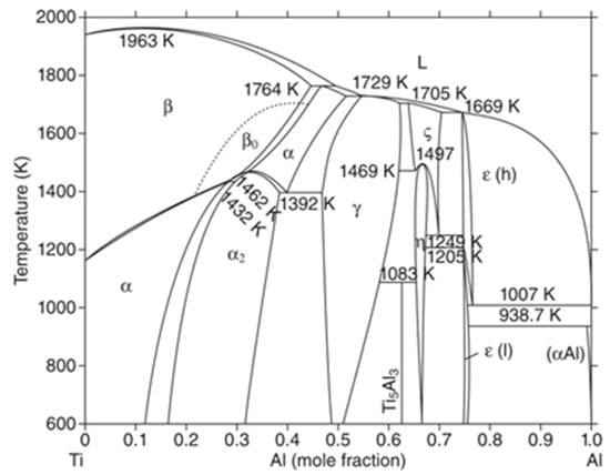 Al–Ti phase diagram (α: α-Ti, β: β-Ti, α2: Ti3Al, γ: TiAl, ε: TiAl3, L: liquid).