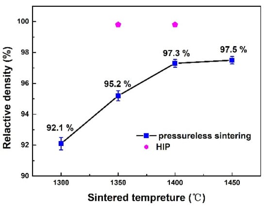 In general, the sample prepared by HIP is developed to pack powder or green body into a capsule welded by steel or titanium plates [11,17]. Subsequent machining processing is required to remove the outer capsule, which is complicated with long process and high cost. For this reason, HIP without a capsule was employed to reduce the residual porosity. The pores in the sintered samples included open pores and closed pores. When the porosity was less than 5%, the proportion of open pores would be greatly reduced. Therefore, the sintered T1350 and T1400 samples with relative density of above 95% were selected for non-capsule HIP. The densities of the HIP processed samples are shown in Figure 6 marked as the “five-pointed stars”. The relative density of H1350 and H1400 reached to 99.8%.