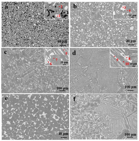 After HIP, the corresponding microstructures with high relatively density were observed. Comparing Figure 6b,c,e,f, it was found that HIP did not change the type of microstructure, and the pores reduced significantly. Although dense microstructure was observed in the HIP samples, grain growth was also inevitable under this HIP condition. Compared to Figure 6b,c, coarse microstructure was obviously found in Figure 6e,f.