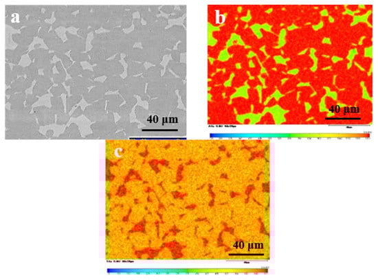 Accordingly, the element distribution of H1350 sample was analyzed (Figure 7). In the γ phase and α2 phase, the distribution of Ti and Al was relatively uniform. It could be proven that the problem of multilayer intermetallic compounds in the prepared PA powder (as seen in Figure 3c) had been solved.
