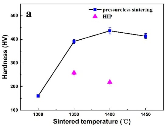 The relationship between Vickers hardness and sintering temperature is shown in Figure 8. The hardness value of as-sintered compact increased with the increasing of sintering temperature, but decreased after 1400 °C. The reason for the hardness increasing was that the relative density increased and the porosity decreased with the temperature increasing at 1300–1400 °C. Upon a further increase in the temperature to 1450 °C, the hardness value decreased due to the coarse grains and the transformed structure from duplex to sub-lamellar structure. High sintering temperature promoted unnecessary grain growth, which was harmful to mechanical properties. Therefore, 1350 °C and 1400 °C were selected as appropriate sintering temperatures for PM Ti-48Al alloys. Compared with as-sintered samples, the HIP samples had lower hardness, as shown in Figure 8a. Under the action of high temperature (1200 °C) and high pressure (140 MPa), the grains significantly grew and the structure became coarser.