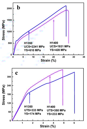 (a) Hardness, (b) compression properties, and (c) tensile properties of the prepared PM Ti-Al alloys. UCS: ultimate compressive strength, YS: yield strength, UTS: ultimate tensile strength.