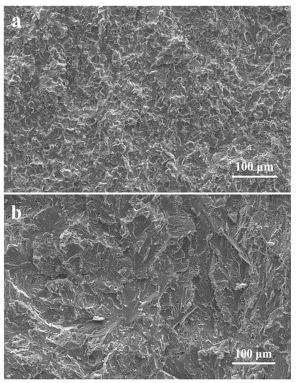 The HIP samples were subjected to a tensile test at room temperature. The tensile strength of the H1350 sample was 333 MPa, while that of the H 1400 sample was 350 MPa. Correspondingly, the tensile fracture morphology was observed, as shown in Figure 9. These two alloys had good densification state with fewer micro-cracks. The fracture was a brittle fracture. The main fracture modes in Figure 9a were consisted with a transcrystalline fracture and intergranular fracture. Besides, the fracture modes in Figure 8b included transcrystalline, intercrystalline, translamellar and interlamellar fractures. The fracture modes of these two alloys were different because the structures were different, as shown in Figure 6e,f. Compared with the H1350 sample with near-γ microstructure, the H1400 sample had duplex microstructure with near-γ and lamellar structure, and thus the fracture appeared as translayer fracture and interlayer fracture. In addition, the cleavage facets were smaller in Figure 9a. This was because the grains became coarser with the sintering temperature increasing.