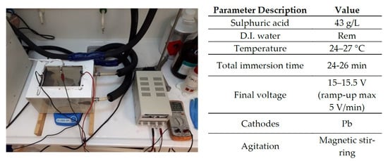TFSAA was initially performed in an experimental, lab-scale setup and then scaled-up in semi-industrial and final industrial conditions. During the anodising cycle the current density, and the electrolyte temperature were recorded. The experimental setup for TFSAA and the process parameters are given in Figure 1.