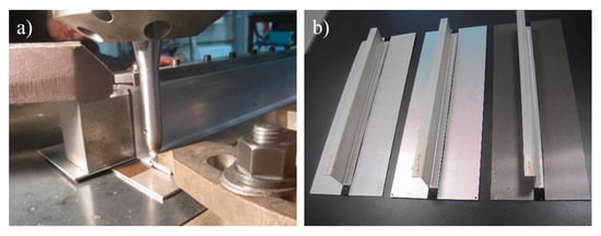 The AA2099-T83 extrusions and AA2060-T8E30 sheets were friction stir welded at LORTEK in the overlap configuration in an I-STIR PDS 4 machine operated in force control. The welding tool, which in previous investigations was shown to have an optimised design for the manufacturing of lap joints [,], consisted of a probe with 3 flats and a mixed thread with a diameter of 4 mm and a length of 2.5 mm. The shoulder had a flat shoulder of 10 mm in diameter. A specifically designed fixture and clamping system was used for the positioning of the AA2099-T83 extrusions on top of the AA2060-T8E30 sheets. All welds were performed at a clockwise rotational speed of 1200 rpm, a welding speed of 250 mm/min, and a forge force of 6.25 kN. The advancing side of the welds was oriented toward the vertical section of the extrusions and the retreating side toward the free side of the extrusions. The tilt angle of the tool was 1.5° in all cases. The main process parameters such as the torque, forge force, and penetration by the welding tool were recorded for their analysis during the FSW process using the controller of the FSW machine. The setup for the FSW process showing the specific fixture, welding tool, and the materials mounted on the FSW machine table as well as some completed FSW coupons can be observed in Figure 2.