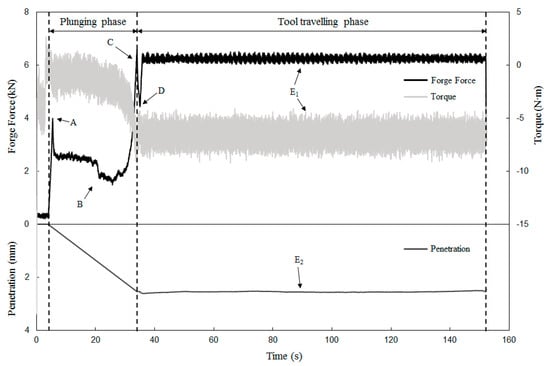 The evolution of the forge force and torque during the tool travelling phase are indicated by detail E1 in Figure 3, whereas the evolution of the penetration is indicated by detail E2. This travelling phase was performed in force control so that the commanded value of the forge force was maintained at 6.25 kN. Slight variations of the tool penetration can be observed, which are produced by the FSW machine in order to maintain the commanded forge force value. The relatively constant values observed for penetration and torque during the tool travelling phase were indicative of a stable FSW process. Note that these two values are not commanded in the force control mode employed in these FSW welds.