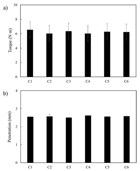 (a) Torque and (b) penetration average values obtained during the friction stir welding (FSW) process for C1–C6 coupons.