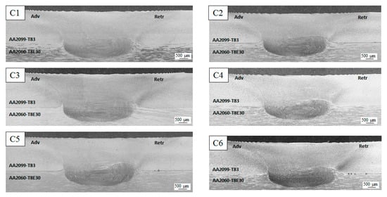 Cross-sectional macrographs of the FSW welds for C1–C6 coupons.