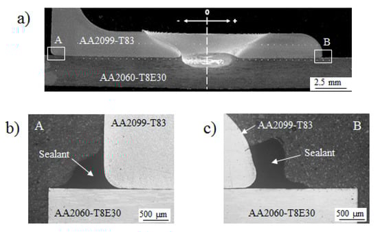 Figure 6 shows a cross-sectional macrograph of the weld specimen obtained from coupon C4 and higher magnification (5×) micrographs of the crevice region in the AA2099-T83 extrusion and AA2060-T8E30 sheet interface. An accumulation of the Naftoseal® MC-780-Class C sealant in the crevice region can be clearly observed in details A and B, i.e., at the edges of the matching interfaces between the overlapping parent materials, indicating that a good protection of this crevice region was obtained by the sealant. These sealant accumulations were consistently observed also in the other coupons C5 and C6 that were produced using the sealant in the extrusion–sheet interface. It is worth noting that no macrostructural defects are observed in these welds using sealant at the matching interface. Thus, the achievement of a good protection of the crevice at the extrusion–sheet interface without impairing the weld quality seems to be feasible by combining un-cured sealant application and FSW.