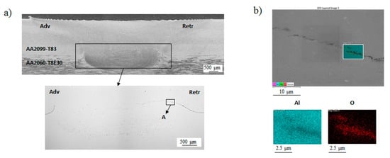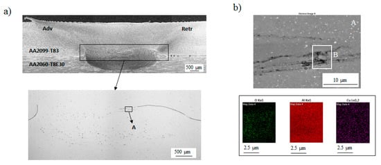 Further microstructural details of the FSW welds were investigated using SEM observation complemented with EDS chemical analysis. Figure 7 shows the results obtained for such analysis performed with the FSW weld from coupon C1, which was produced with as-received base materials and without sealant application. The macrograph and the detail shown in Figure 7a were performed after chemical etching and before chemical etching respectively in order to get a more clear observation of the weld features. It can be observed that a very clear SZ region was obtained with no major contaminant agents, except in a reduced cold lap region located in the hook region of the retreating side (highlighted in detail A in Figure 7a). SEM observation and EDS analysis shown in Figure 7b revealed the presence of oxide remnants at the interface between the AA2099-T83 extrusion and the AA2060-T8E30 sheet, which are indicative of a non-complete break, dispersion, and mixing of the inherent oxide layer present at the surface of the parent materials before the FSW process.