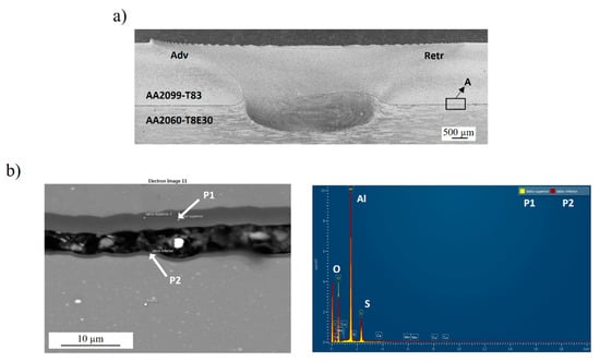 Figure 8 shows the cross-sectional macrograph of coupon C2, as well as the SEM observation and the EDS analysis carried out at the interface between the AA2099-T83 extrusion and the AA2060-T8E30 sheet, as indicated by detail A in Figure 8a. The SEM analysis (Figure 8b) revealed the presence of continuous thin layers of aluminium oxide at the surface of both AA2099-T83 and AA2060-T8E30 alloys as a result of the TFSAA process applied to the parent materials before the FSW process. The thickness of the oxide layer in the AA2099-T83 extrusion was approximately 3 µm, whereas in the AA2060-T8E30 sheet, it was approximately 1 µm. The chemical composition analysis carried out by EDS in both oxide layers, which are represented as points P1 and P2 in Figure 8b, revealed an identical composition for both coatings, which was mainly composed of aluminium, oxygen, and sulphur. The sulphur content of the coating was indicative of the characteristics of the anodising process based on the use of sulphuric acid.